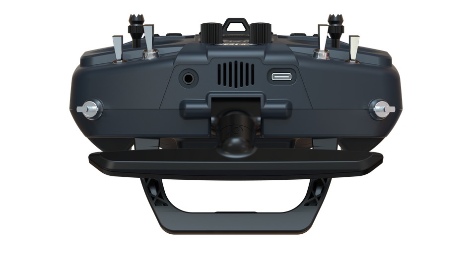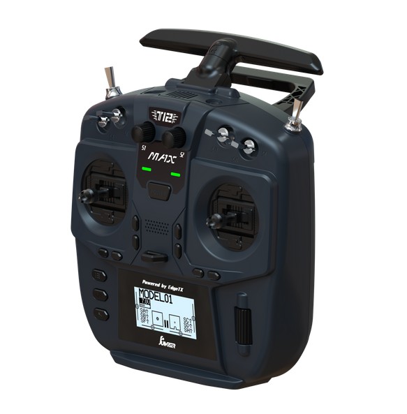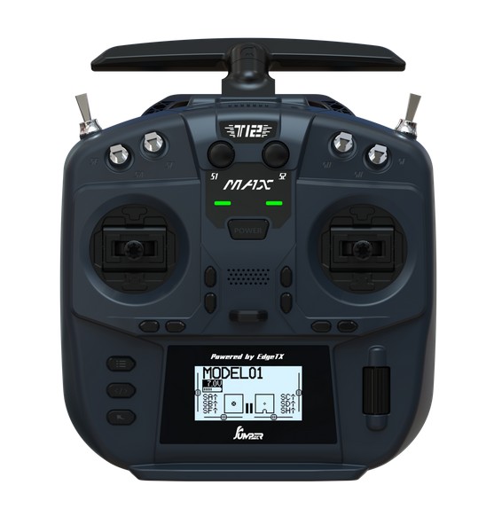 Jumper T12 Max is a classic-format transmitter suitable for both beginner and advanced pilots. The transmitter runs on EdgeTX firmware and is equipped with an integrated ExpressLRS (ELRS) module operating at 2.4GHz with a power output of up to 500mW. It features hall-effect gimbals for precise and smooth control. The transmitter includes 6 switches and 2 potentiometers. For easy transport, it has a foldable handle, and the antenna is also foldable and rotatable. Information is displayed on a monochrome LCD screen measuring 1.7 inches. A significant advantage is the integrated memory, which replaces the traditional SD card, significantly increasing the reliability of the radio. On the back of the transmitter, there is a standard JR bay for adding external modules. The transmitter can be powered by two 21700 Li-ion batteries (not included), which significantly extend operating time. The batteries can be conveniently charged via the USB-C connector with support for up to 10W charging power. A major feature of this radio is the aforementioned integrated ELRS module with a power output of up to 500mW and a refresh rate of up to 1kHz. ExpressLRS (abbreviated ELRS) is an open-source project with transmitter and receiver modules produced by various manufacturers. ELRS is currently one of the most advanced RC systems, offering a reliable long-range link, high refresh rates, adjustable power output, updates via Wi-Fi, and more. ELRS at 2.4GHz outperforms traditional RC systems in every aspect while maintaining short antennas.