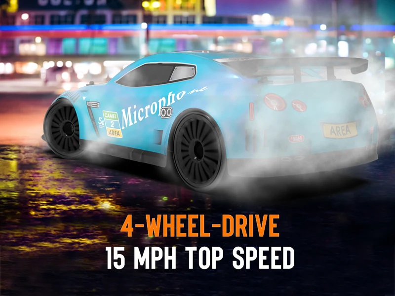 【4 Wheels Drive Drift Cars】This drift kids car, equipped with 4 wheel-drive system system and powerful motors, has strong power and driving force. Let the remote control toy car to conquer different terrains or drift on road easil to bring you incredible driving experience. The led lights of toy car allows for nighttime playing.