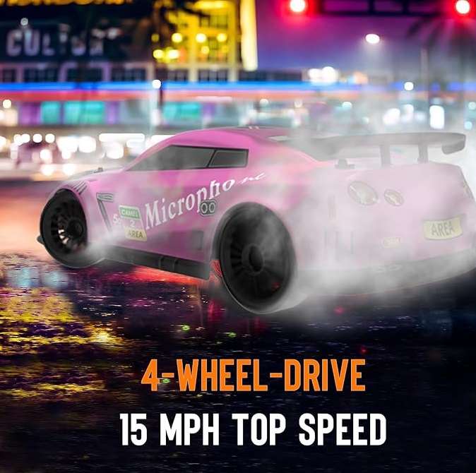 【4 Wheels Drive Drift Cars】This drift kids car, equipped with 4 wheel-drive system system and powerful motors, has strong power and driving force. Let the remote control toy car to conquer different terrains or drift on road easil to bring you incredible driving experience. The led lights of toy car allows for nighttime playing.