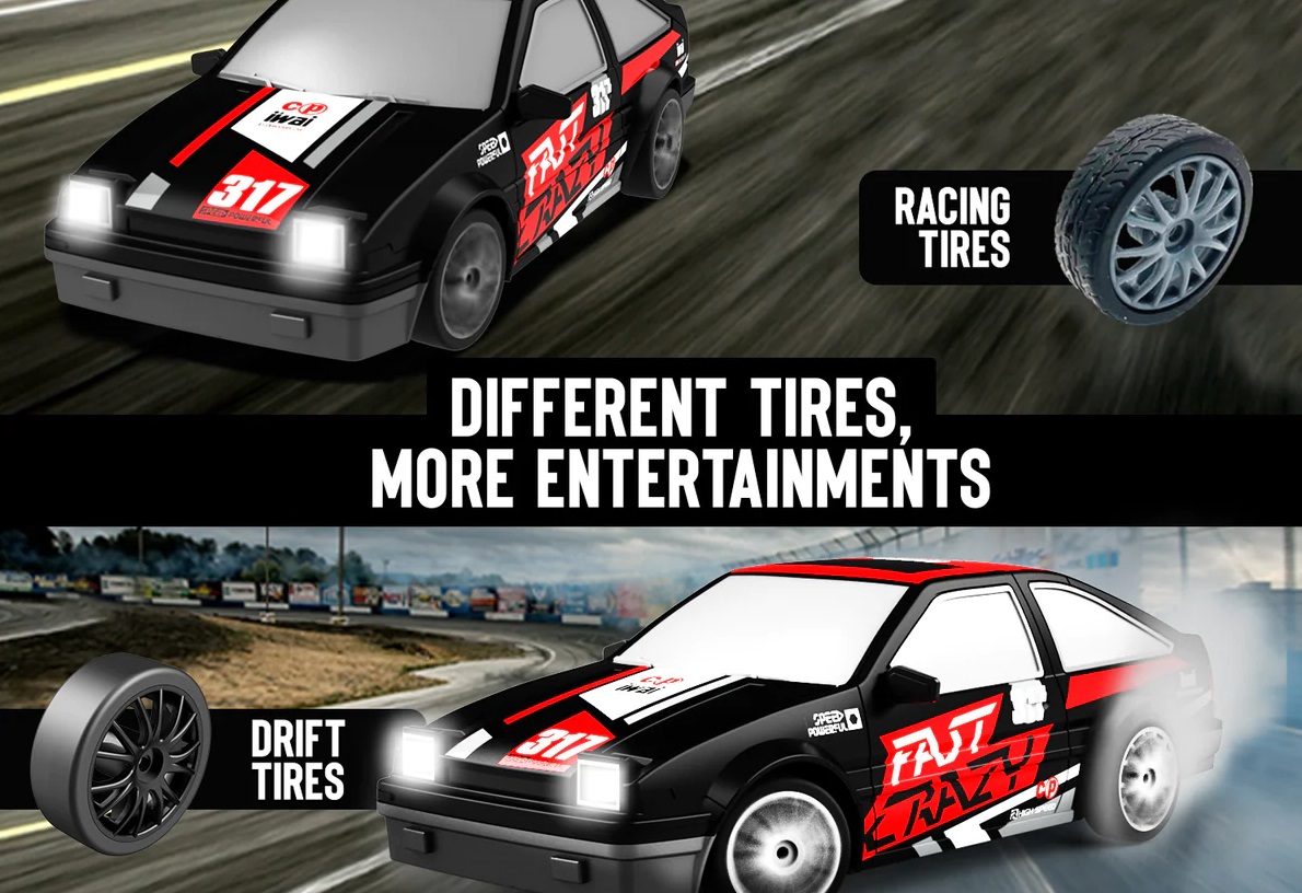 Versatile Mini Drift RC Car-This mini RC drift car comes with replaceable racing and drifting tires, allowing you to switch between high-speed races and drift races with ease.
