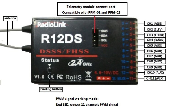 Radiolink R12DS, 2.4G 12 channels receiver, DSSS and FHSS spread spectrum working synchronously, compatible with Radiolink transmitters AT9, AT9S, AT10 and AT10II(AT9, AT9S, AT10 and AT10II can upgrade to 12 channels just upgrade by firmware, you can download the firmware from our website: ).