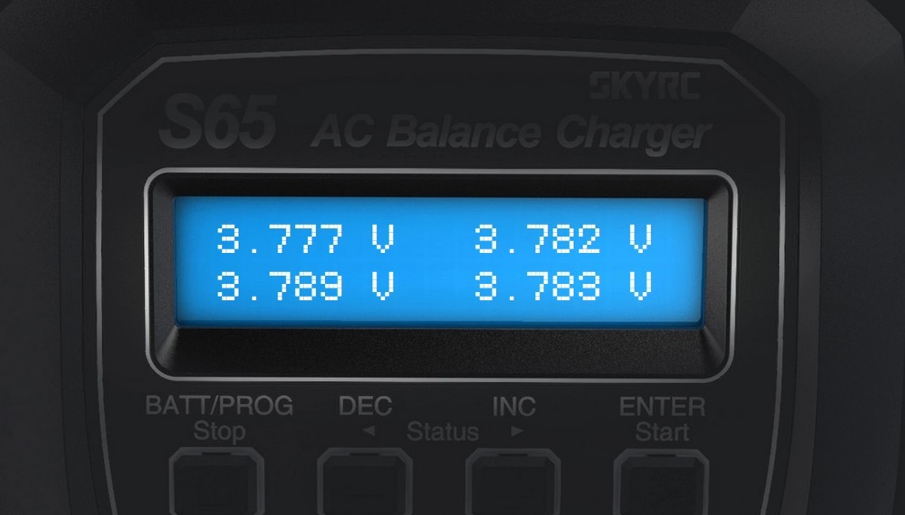 SkyRC S65 is an AC input high-performance micro processor control charge/discharge station with battery management suitable for use with all current battery types, LiPo, Lilon, LiFe, NiCd, NiMH, PB and also new generation LiHV with end voltage 4.35V. It is an AC input charger/discharger with compact size. The maximum charging power of S65 is 65W with maximum charging current 6A and discharging current 2A.
