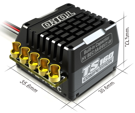 | TORO TS160 is designed for 1/10th cars. It runs on 2S to 3S LiPo batteries and has a built-in BEC with 5A and 6.0V/7.4V selectable voltage output. And it comes with internal power capacitors, high speed fan and built-in power switch. |