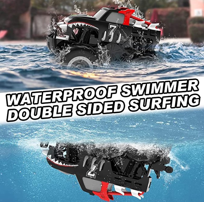 【DOUBLE SIDED WATER DRIVING】- With awesome double-sided water surfing design, this amphibious remote control car can easily roll over and keep driving in water. 2.4Ghz radio frequency system enable multiple rc cars to race together at the same time. This toy boats for water play is very suitable for boys ages 4-7 to play, perfect gifts for kids and toy car for family indoors & outdoors activities.