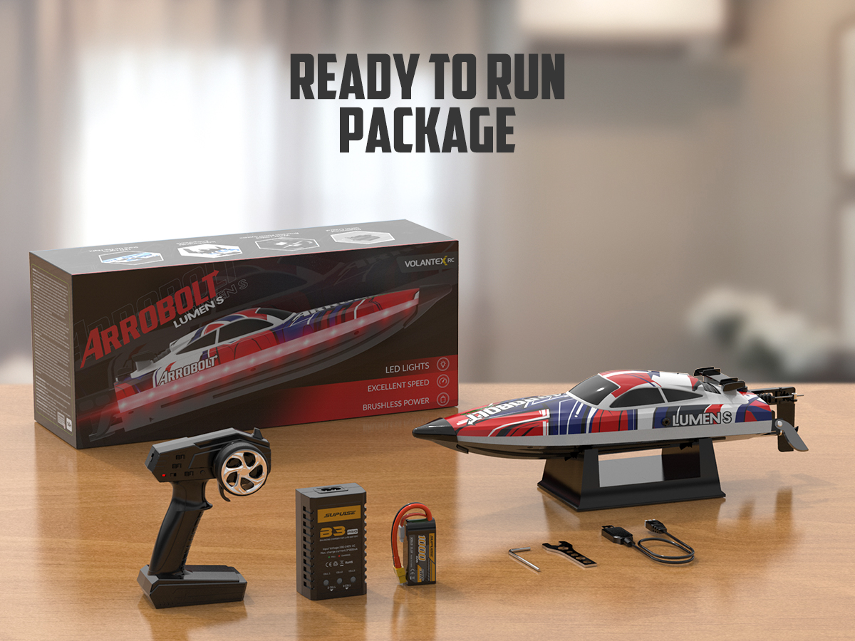 【HIGH SPEED RC BOATS WITH BRUSHLESS MOTOR】The Arrobolt Lumen S is propelled by a powerful water-cooled brushless motor, designed for enthusiasts seeking exhilarating speeds up to 35+MPH. This motor, coupled with an innovative low-resistance hull, ensures stable and swift racing. The full-throttle control allows for precise speed adjustments, providing a responsive and engaging experience that hobbyists crave. 【MULT-FUNCTION REMOTE CONTROL BOAT】Auto self-righting features get the RC racing boat back to the game quickly while the boat is capsizing. The special reverse-function will keep you stay away of obtacle, just need to reverse it back to route. Have more fun with the remote control watercraft. 【HAVE MORE FUN WITH THE BRUSHLESS RC BOATS & SHIPS】High waterproof system with only a single cover can keep the water out of fast rc boat. 2.4Ghz radio-controlled distance of over 656ft, good interferrence ability, allows more than 20 remote control boats to be raced at the same time. 【DURABILITY AND LONGEVITY】 Our racing boat is constructed with high-quality materials, including an upgraded anti-collision silicone head for enhanced durability. Built to withstand harsh conditions and the rigors of extreme racing, it ensures long-lasting performance. A low battery and weak signal alarm system keeps you informed, ensuring a pleasant and uninterrupted water journey. 【BEST FAST RC BOATS FOR ADULTS】No matter your skill level, features everything experts and beginners alike want in Arrobolt lumen S. Fully assembled, no installation required. Include all parts needed to get the RC racing boat started. RTR version will make it portable with you wherever you go.
