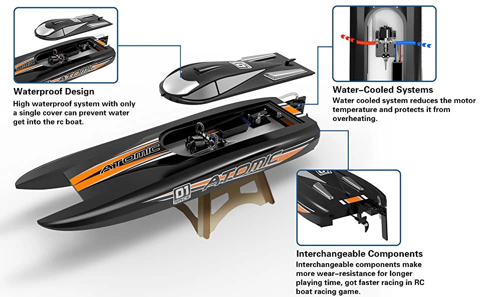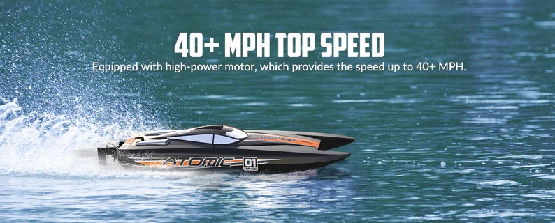 Remote Control Boat Brushless RC Boat AtomicX 40MPH High Speed RC Watercraft Unibody Hull, Improved Waterproof Design for Lakes and Rivers. Special ABS plastic unibody hull design, strong structure and crack resistant, will prevent the boat from impact damage of high-speed driving, this is a ship which can accompany you for a long time.